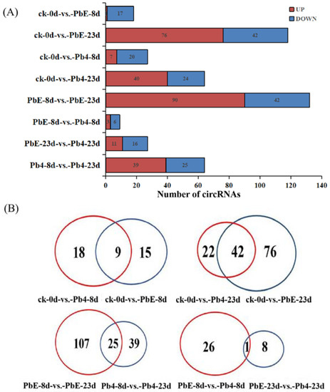 (A) Comparison of the number of circRNAs between control plants and plants infected with the two pathotypes of P. brassicae at 8 and 23 dpi. Blue and red represent up-and downregulated circRNAs, respectively. The results of 8 comparisons are shown. (B) Venn diagrams showing the overlaps of circRNAs differentially expressed in each comparison.