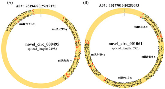 To determine whether circRNAs in B. rapa could affect post-transcriptional regulation by binding to miRNAs and preventing them from regulating their target mRNAs, we identified miRNA target sites of circRNAs in B. rapa and found that 257 of 1636 (15.7%) circRNAs had putative miRNA-binding sites (Table S3). Of these 257 circRNAs, 116 had more than one different miRNA-binding site, and the greatest number of miRNA-binding sites (39) was found in novel_circ_000502. miR5021-x and miR2275-x accounted for most of the circRNAs (55 and 38, respectively). Similarly, novel_circ_000495 and novel_circ_001061 were differentially expressed between Pb4- and PbE-inoculated plants at 8 dpi, with 3 and 2 miRNA-binding sites, respectively (Figure 5). These results indicate that circRNAs in B. rapa have many potential miRNA-binding sites and probably affect the expression of disease resistance genes through miRNA.