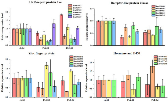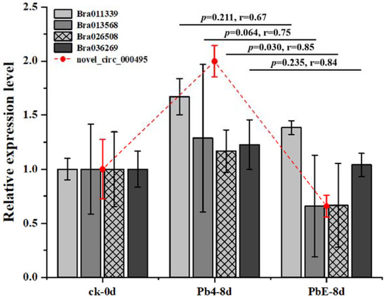 To better understand the gene regulatory network during the infection of Brassica rapa, DE circRNAs and their target genes in the PbE-8d-vs.-Pb4-8d group were selected for circRNA–miRNA–mRNA network analysis with Cytoscape software (http://www.cytoscape.org/ (accessed on 19 May 2021)) (Figure S3). By predicting the miRNAs and their target genes of circRNAs, many miRNA-targeted mRNAs were annotated as stress-associated. A total of 20 target genes were annotated with “receptor-like protein kinase”, “zinc finger protein”, “LRR-repeat protein” and “hormone and P450” functions (Table S4). The relative expression levels of these candidate target genes showed diverse expression patterns (Figure 6). Here, 4 target genes, Bra011339 (zinc finger protein), Bra013568 (zinc finger protein), Bra026508 (hormone-related), and Bra036269 (LRR-repeat protein), were consistent with the expression pattern of novel_circ_000495 at 8 dpi (Figure 7). Bra011339 is the homolog of At4g32340, encoding a tetratricopeptide repeat (TPR)-like superfamily protein, and it is widely involved in biological processes, such as cell cycle regulation, protein transport, mitosis, steroid receptor function, RNA splicing, transcriptional repression, protein degradation, and stress. Bra013568 is annotated with the zinc finger MYND domain protein. However, related studies on plants are rare. Bra036269 is the homolog of At4g02410, which is annotated with LECRK43. Studies have shown that overexpressing plants display increased resistance to infection by Botrytis cinerea compared to wild-type Arabidopsis thaliana [46]. However, only Bra026508 (homolog of At4g15330, which annotated with CYP705A5) showed significant differential expression between plants inoculated with Pb4 and PbE, and Pearson’s correlation analysis suggested a positive correlation between Bra026508 and novel_circ_000495 under P. brassicae infection (r = 0.85), indicating that expression of the target genes could be enhanced in response to P. brassicae infection. Therefore, the circRNA novel_circ_000495 probably plays an important role in clubroot resistance through post-transcriptional control of its target genes, which are involved in biotic stress. Furthermore, further research is needed to confirm the function of Bra026508 in the P. brassicae resistance mechanism, and other disease-related genes are also worth exploring.