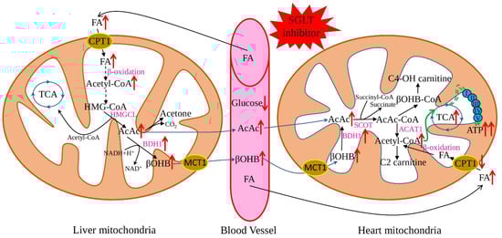 Effect of SGLT2 inhibitors on ketone body metabolism. The application of SGLT2 inhibitors reduces plasma glucose levels and subsequently promotes lipolysis in adipose tissue and FA production, which further enhances the generation of ketone bodies. Ketone bodies are converted to acetyl-CoA in the heart easier than glucose and FA. At the same time, SGLT2 inhibitors increase the expression of the key genes responsible for ketone oxidation, which leads to the metabolic shift to the ketone bodies as a preferable substrate. Red arrows show the effect of SGLT2 inhibitors on the key metabolites and enzymes; black arrows—flows of the main metabolites; green arrows—ATP production by the mitochondrial oxidative phosphorylation system. FA—fatty acids, AcAc CoA—acetoacetyl CoA, HMG-CoA—3-hydroxy-3-methtylglutaryl-CoA, βOHB—β-hydroxybutyrate, TCA—tricarboxylic acid cycle, HMGCL—3-hydroxy-3-methylglutaryl-coenzyme A lyase, BDH1—mitochondrial β-hydroxybutyrate dehydrogenase, ATP—adenosine triphosphate, ACAT1—acetyl-CoA acetyltransferase, C2-carnitine—acetylcarnitine, C4-OH carnitine—hydroxybutyrylcarnitine, CPT1—carnitine palmitoyltransferase 1, SCOT—succinyl-CoA:3-oxoacid-CoA transferase.