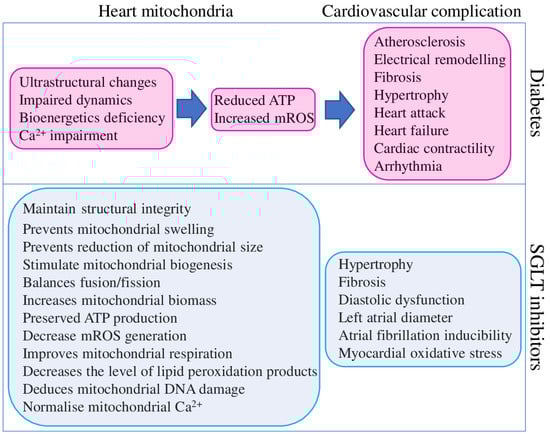 Contribution of diabetes to cardiovascular complications mediated through heart mitochondria dysfunction (magenta) and beneficial effects of SGLT2 inhibitors on mitochondria function and cardiovascular system (blue).