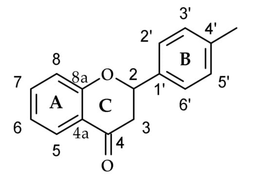 The biotransformation substrate, 4′-methylflavanone (4) was obtained by the chemical synthesis that was previously described by our team []. The physical data, including, color and form, melting point (°C), molecular ion mass, molecular formula, retention time tR (min), retardation factor Rf, optical rotation with concentration c (M), and NMR spectral data of the resulting compound 4 are presented in Table 1 and Table 2, and in the Supplementary Materials.