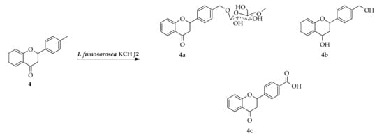 As a result of biotransformation of 4′-methylflavanone in the culture of I. fumosorosea KCH J2, three products, i.e., flavanone 4′-methylene-O-β-D-(4″-O-methyl)-glucopyranoside (4a) with 13.7% yield (12.4 mg), 2-phenyl-(4′-hydroxymethyl)-4-hydroxychromane (4b) with 5.6% yield (3.0 mg), and flavanone 4′-carboxylic acid (4c) with 6.0% yield (3.4 mg) were obtained (Scheme 2).