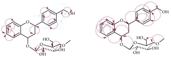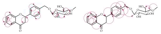 In the case of product 4a, 4″-O-methyl-glycosylation, which occurred at C-4′-CH3 was observed (Scheme 3). The characteristic carbon signals visible in the region from about δ = 80 ppm to about δ = 62 ppm in the carbon-13 nuclear magnetic resonance (13C-NMR) spectrum (Supplementary Materials: Figure S28) and protons H2″–H6″ signals ranging from about δ = 3.8 ppm to about δ = 3.1 ppm in the proton nuclear magnetic resonance (1H-NMR) spectrum (Supplementary Materials: Figure S25) evidenced the presence of a glycosidic moiety. Additionally, the attachment of a glucose unit to substrate 4 was confirmed by the presence of a one-proton doublet from proton 1″ at the anomeric carbon atom at δ = 4.39 ppm in the 1H-NMR spectrum with the coupling constant (J = 7.7 Hz) characteristic for its β-configuration (Supplementary Materials: Figure S25). A three-proton singlet at δ = 3.51 ppm in the 1H NMR spectrum with the corresponding signal at δ = 60.5 ppm in the 13C-NMR spectrum evidenced the presence of the -OCH3 moiety (Supplementary Materials: Figures S25 and S28). Based on the HMBC experiment, we concluded that O-methylation occurred at the C-4″ hydroxyl group of the sugar moiety, because the proton signal due to -OCH3 was correlated with the signal of C-4″ (about δ = 80 ppm) (Supplementary Materials: Figure S37). The position of the substitution with the glucose unit was established as C-4′-CH3 because the proton singlet of the methyl group at C-4′ (δ = 2.36 ppm) disappeared in product 4a, and two one-proton signals from the –CH2 moiety appeared in the 1H NMR spectrum at δ = 4.92 ppm (J = 12.3 Hz) and δ = 4.66 ppm (J = 12.3 Hz) with the corresponding carbon signal at δ = 70.6 ppm in the 13C NMR spectrum (Supplementary Materials: Figures S23, S25, and S28). Furthermore, the signals from the flavanone A-ring remained intact. The characteristic AA’BB’ coupling system with the signals from protons at C-2′, C-6′ and signals from protons at C-3′, C-5′ only slightly shifted, which confirmed substitution at C-4′-CH3 (Supplementary Materials: Figures S24 and S27). Additionally, in the HMBC experiment, the proton at the anomeric carbon atom (δ = 4.39 ppm) was coupled with the C-4′-CH2 signal (δ = 70.6 ppm) (Supplementary Materials: Figure S37).