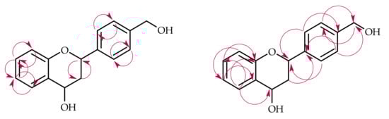 The structure of product 4b was established as 2-phenyl-(4′-hydroxymethyl)-4-hydroxychromane (Scheme 4). The disappearance of the 4′-methyl group signal at 2.36 ppm and the appearance of the methylene group signal at 4.66 ppm in the 1H NMR spectrum proved that substitution occurred at 4′-CH3 of the substrate 4 (Supplementary Materials: Figure S46). In addition, the signal of two protons at C-3′ and C-5′ shifted towards the lower field from δ = 7.26 ppm (in 4) to δ = 7.41 ppm (in 4b) (Supplementary Materials: Figures S4 and S45). In the HMBC experiment, the protons at C-4′-CH2- coupled with the signal from C-3′, C-5′, which also confirmed substitution at 4′-CH3 (Supplementary Materials: Figure S56). However, the shifts of all the A-ring protons and 3ax (pseudo-axial) and 3eq (pseudo-equatorial) protons indicated another change that occurred in the C-ring at C-4. A triplet appeared in the 1H NMR spectrum at δ = 4.78 ppm, indicating that the carbonyl group at C-4 had reduced. As a result, the signals from two protons at C-3 shifted towards the higher field from δ = 3.15 ppm (3ax in 4) and δ = 2.83 ppm (3eq in 4) to δ = 2.21 ppm (3ax in 4b) and δ = 2.12 ppm (3eq in 4b), which proved reduction reaction at C-4. Similarly, the signal from the proton at C-2 shifted slightly from δ = 5.59 ppm (in 4) to δ = 5.30 ppm (in 4b) (Supplementary Materials: Figures S3 and S44).
