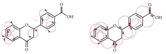 Another biotransformation product was determined as flavanone 4′-carboxylic acid (Scheme 5). In the 1H NMR spectrum, the signal from the C-4′ methyl group was absent and no other signal appeared. Moreover, the signals from the protons at C-2′, C-6′ and C-3′, C-5′ were shifted towards the lower field from δ = 7.47 ppm (C-2′, C-6′ in 4) and δ = 7.26 ppm (C-3′, C-5′ in 4) to δ = 7.75 ppm (C-2′, C-6′ in 4c) and δ = 8.12 ppm (C-3′, C-5′ in 4c) (Supplementary Materials: Figures S4 and S65). Based on these data, it can be concluded that the C-4′ methyl group was oxidized to the C-4′ carboxylic group. Moreover, in the HMBC experiment, the signal from protons at C-3′, C-5′ correlated with the signal from carboxylic carbon at δ = 167.3 ppm, and the signal from protons at C-2′, C-6′ correlated with the signal from C-4′ at δ = 131.6 ppm (in 4c), which was shifted from δ = 137.4 ppm (in 4) (Supplementary Materials: Figures S7 and S75).