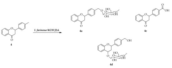 4′-Methylflavanone (4) was also used in the biotransformation performed in the culture of I. farinosa KCH J2.6. As a result, the following products were obtained: flavanone 4′-methylene-O-β-D-(4″-O-methyl)-glucopyranoside (4a) with a 15.3% yield (13.8 mg), flavanone 4′-carboxylic acid (4c) with a 6.6% yield (3.7 mg), and 4′-hydroxymethylflavanone 4-O-β-D-(4″-O-methyl)-glucopyranoside (4d) with 3.7% yield (3.4 mg) (Scheme 7).