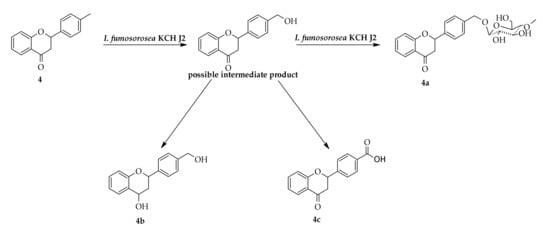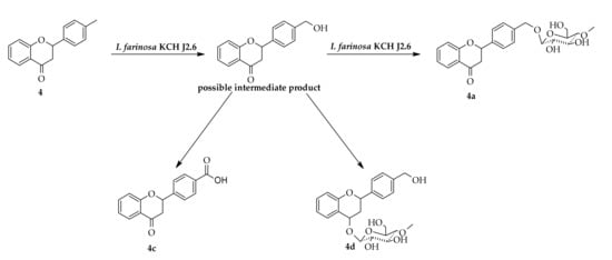 In the case of microbial transformation in the culture of B. bassiana KCH J1.5 only one main product (4a) with a high isolated yield (52%) was observed, which suggests that glycosyltransferase, responsible for the glycosylation of the hydroxyl moiety, was very efficient. On the other hand, biotransformation of 4′-methylflavanone with the use of I. farinosa KCH J2.6 led to the formation of products 4a, 4c, and 4d. It can be assumed that 4′-hydroxymethylflavanone can be a possible intermediate product, which was further transformed by the three competing enzymes into products 4a, 4c, and 4d. The analogous products of glycosylation at C-4 by the strain I. fumosorosea KCH J2 enzymatic system were previously observed in the case of 6-methylflavanone and 2′-methylflavanone biotransformations [,]. The presumable course of 4′-methylflavanone biotransformation in the culture of I. farinosa KCH J2.6 is shown in Scheme 10.
