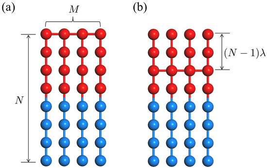 Using the bead-spring chain model by DPD, architecturally monodisperse BBCs, each of which has a given chain architecture characterized by a set of parameters , were generated in a simulation box with a number density of beads chosen for the molten state. The periodic boundary conditions were applied in all axes of the simulation box. The unfavorable interaction between the bead of type A and type B was modeled using the maximum repulsion introduced in Equation (11), whose value is given from the Flory interaction parameter between A- and B-bead, , using the relation, , where and the density-dependent parameter c is given as for the present choice of bead density [38]. The maximum repulsion between the same kind of beads is set to be and that between A and B beads, , is given according to a desired . The ordered state of each system was obtained by stepwise-increasing from an athermal state () to with an increment of . Having obtained the ordered structures at , each ordered system was then slowly annealed to a desired by stepwise-decreasing with a very small decrement of where the system was equilibrated at each of for followed by the production step for to produce configuration samples for thermodynamic average.