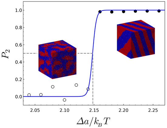 The order parameter versus the interaction parameter for the BBC having the architectural parameters of . The open circles and filled circles represent the points where the disordered and the ordered phases are stable, respectively, and the blue solid line is fit to a three-parameter sigmoidal function. The inset images show the two example structures simulated at the disordered and ordered region.