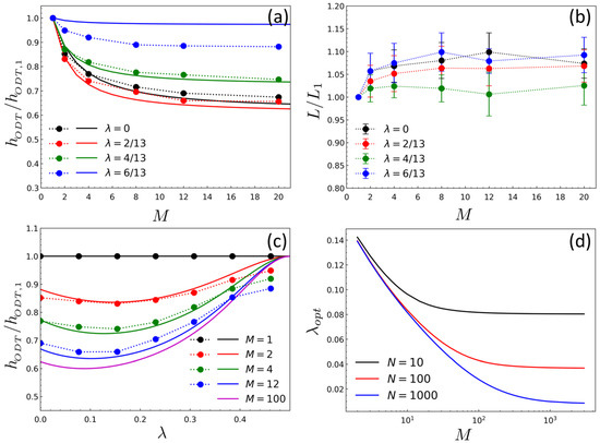 The behavior of ODT and domain spacing of BCPs with various chain topologies: (a) The normalized ODT () as a function of the backbone length M for different topology parameter , where is of diblock (); (b) the normalized domain spacing () as a function of the backbone length M for different , where represents L at ; (c) The normalized ODT as a function of for different M; (d) The optimal value of topology parameter () as a function of M for different N. In (a–d), the symbols with dotted lines represent the DPD results and the solid lines represent the RPA results. All computations were obtained for the side chain length of . The domain spacing shown in (b) were obtained at .