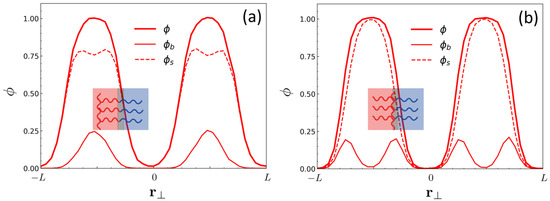 The local volume fraction of A-monomers (), that belonging to the backbone (), and that belonging to the side chain () in the direction perpendicular to the lamellar interface () obtained by DPD simulations for (a) and for (b) . All profiles were obtained at . The pictures in the inset show the schematic representations of BBC organization in the lamellar phase with a half pitch for each case.