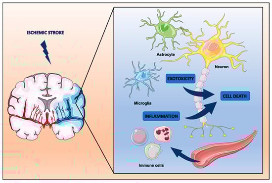 Apart from excitotoxicity, hypoxia-triggered inflammation is another key factor in stroke pathophysiology []. Minutes after hypoxia, neurons release damage-associated molecular patterns which activate resident microglia []. Activated microglia, in turn, migrate to the infarct core and to the penumbra and mediate detrimental or protective effects depending on their specific subtype []. Furthermore, the secretion of different pro-inflammatory proteins such as tumor necrosis factor α and interleukins by microglia, neurons and endothelial cells additionally amplifies inflammatory response []. The latter enhances the expression of adhesion molecules on endothelial cells and a breakdown of the blood–brain barrier, resulting in extravasation of immune cells into the brain parenchyma []. During the first minutes and hours, mainly neutrophils and monocytes enter the brain and exacerbate the inflammatory response []. Additionally, T cells can enter the parenchyma and exert detrimental or protective effects [], thus contributing to neuronal cell loss, mainly through necrosis or apoptosis, although additional and novel forms of cell death are likely to be involved as well.