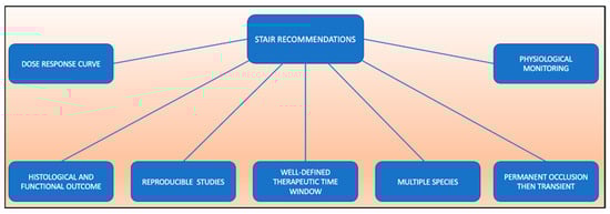 The STAIR recommendations, initially published in 1999, were intended to improve the quality of preclinical studies investigating possible novel stroke therapies []. According to the initial STAIR recommendations, adequate dose–response curves, defined time windows in well-characterized models, blinded and controlled reproducible studies, assessment of histological and functional outcomes, and permanent vessel occlusion followed by transient occlusion should be provided (overview in Figure 2). In addition, initial rodent studies should be followed by studies in gyrencephalic species. The aspects of dose–response curves, therapeutic time windows, outcome measures, multiple species use and reproducibility were revised in an updated version but remained valid []. To fulfil reproducibility, experiments should be replicated in at least one or more independent laboratory. The fundamentals of good scientific inquiry should also be applied by implementing randomization and eliminating outcome assessment bias, reporting the reasons for excluding animals from final data analyses and defining inclusion/exclusion criteria, performing power analysis and sample size calculations, and declaring any relevant conflicts of interest []. However, these criteria are not binding, and a vast number of studies still do not consider them fully.