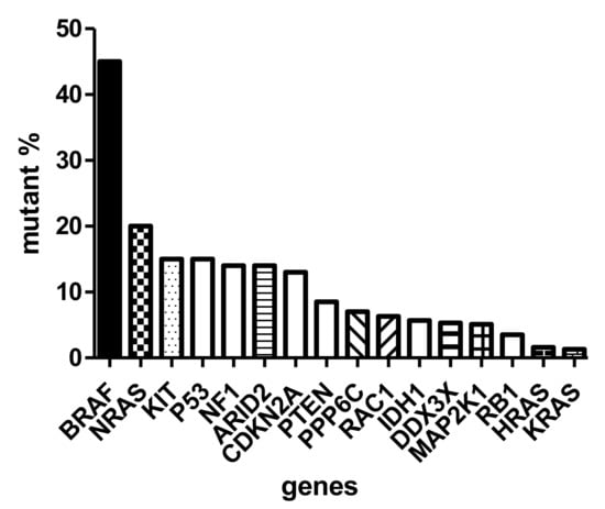 - Zhang, T.; Dutton-Regester, K.; Brown, K.M.; Hayward, N.K. The genomic landscape of cutaneous melanoma. Pigment Cell Melanoma Res. 2016, 29, 266–283. [Google Scholar] [CrossRef]