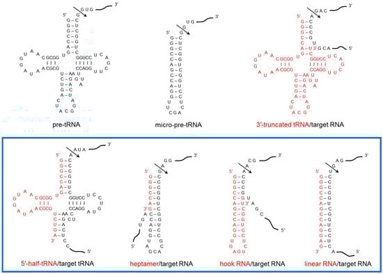 tRNase ZL primarily recognizes the L-shaped folding structure formed from the cloverleaf-like secondary structure of pre-tRNA and cleaves it after the discriminator nucleotide to remove its 3′ trailer []. In the same fashion, a pre-tRNA-like RNA complex formed between a target RNA and a 5′-half-tRNA or 3′-truncated tRNA can be recognized by tRNase ZL and the target RNA can be cleaved [,].