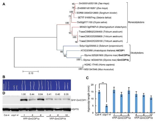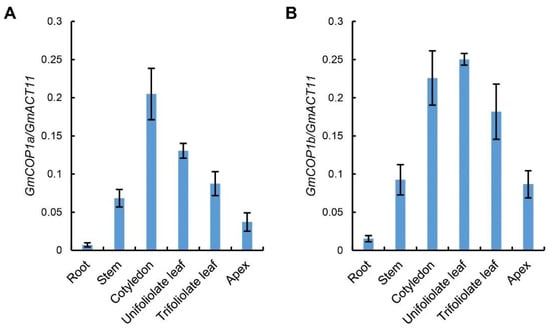 2.2. The Expression Profiles of GmCOP1a and GmCOP1b