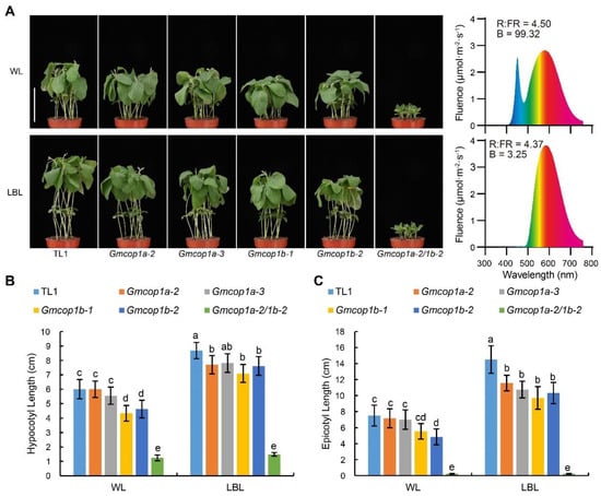 2.5. GmCOP1a and GmCOP1b Regulate the Low Blue Light Response of Soybean