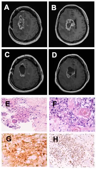 MRI scans and histopathology of tumor. MRI scans were obtained immediately before and after the last surgical intervention and prior to study admission. In (A,B), T1-weighted sequences with gadolinium show the contrast-enhancing tumor components in the right frontomedial cortex and deep right frontal lobe, causing a significant mass effect. At this time (September 2018), the patient was in KPS60, and a new surgical evacuation of the tumor was indicated. In (C,D), T1-weighted sequences with gadolinium show post-operative results. CST was then referred to the vaccination study. (E) Hematoxylin–eosin staining showing highly cellular and pleomorphic infiltrative neoplasm and depicting spindled, ovoid, or stellate glial cells with marked anaplasia (200× magnification). (F) Hematoxylin–eosin staining at higher magnification (400×), where proliferated microvessels are depicted amidst marked pleomorphic glial cells. (G) Immunohistochemical staining for IDH-1 mutation, where neoplastic cells present strong and diffuse nuclear and cytoplasmic expression of IDH-1 (400×). (H) Immunohistochemical staining for ATR-X showing preserved nuclear expression (200×).