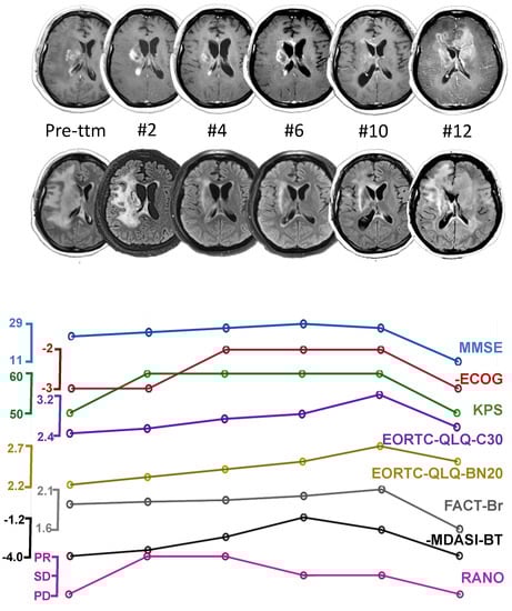 Clinical radiological outcome during vaccination. First line: T1-weighted MRI images with gadolinium. From left to right: images obtained over progressive timepoints, starting with pre-treatment. Numbers below each image correspond to the vaccination dose number, as well as the month post-treatment when each dose was taken. Second line: corresponding FLAIR images obtained at each vaccination dose. Note the significant tumor reduction beginning at dose #4 observed on both sets of images, with significantly reduced midline shift and mass effect (most visible on FLAIR), followed by a stable period from dose #6 to #10, and then rapid deterioration from dose #10 to #12. The line graphs represent the evolution of clinical and quality of life scores over the 12 months of vaccination. Each point is temporally matched to the images above. Score signs were adjusted so that upward evolution indicates clinical improvement. MMSE improved consistently from 23 at the beginning to 25 by dose #2, 27 by dose #4, and 29 by dose #6. At dose #2, CST’s KPS had improved by 10 points and remained at that level until dose #10; by dose #4, ECOG improved by 1, and remained stable up to dose #10. QoL according to EORTC scores, FACT-Br, and MDASI improved progressively, while RANO criteria indicated a partial response corresponding to tumor shrinkage. After dose #10, progressive clinical and radiological deterioration was observed for all measures. Legends: PR: partial response, SD: stable disease, PD: progressive disease.