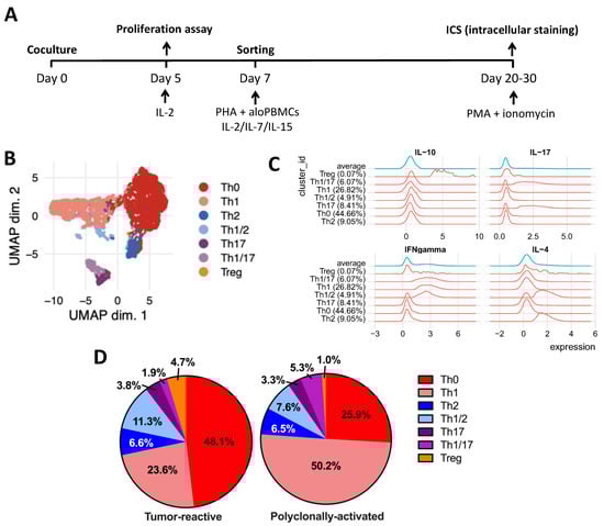 Characterization of CD4+ Th cell subpopulation using bioinformatic tools. (A) Experimental design to evaluate frequency and phenotype of tumor-reactive T cells in CST’s blood. Blood was collected before each vaccination dose, and PBMCs were obtained by gradient centrifugation. CFSE-labeled T cells were cocultured, in replicates, with monocyte-derived dendritic cells in the presence of tumor lysate for 5 days, when half of each well was independently assessed for proliferation by flow cytometry to calculate the frequency of tumor-reactive T cells. The other half of each well and the replicates not used for the proliferation assay were cultured in the presence of IL-2 for 2 more days and the CFSElowCD25+ proliferating T cells were sorted. Sorted cells were expanded in the presence of PHA, irradiated allogeneic PBMCs (allo-PBMC), IL-2, IL-7, and IL-15. After expansion, the cells were stimulated overnight with PMA + ionomycin in the presence of brefeldin, and their cytokine production profile was assessed via intracellular staining (ICS) []. (B) The identification of the different T-helper subtypes was conducted by means of unsupervised clustering using FlowSOM and ConsensusClusterPlus R packages, with the ICS flow cytometry data of expanded tumor-reactive T cells []. The cell subtypes were visualized using the dimension reduction technique, UMAP. (C) Histograms of cytokine expression per cluster obtained by the FlowSOM clustering. (D) CD4+ T cells proliferating to a polyclonal CD3/CD28 bead polyclonal stimulus or to the presence of antigen-presenting cells loaded with the patient’s tumor lysate (tumor-reactive) were sorted, expanded, and had their helper phenotype determined (as described above). The frequency of each population in the patient’s blood at the onset of immunotherapy was plotted as a percentage in the pie chart.