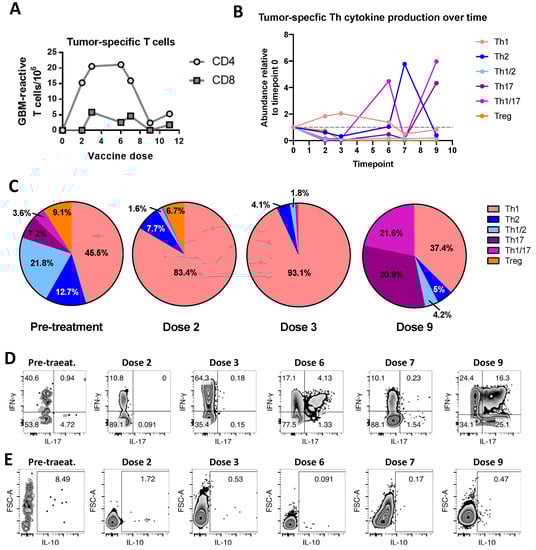 Evolution of tumor-specific CD4+ T-cell phenotype during treatment. (A) The frequency of CD4+ and CD8+ tumor-specific T cells in the patient’s blood was determined by evaluating the presence of proliferating T cells, when challenged with the tumor lysate, in independent wells. The calculation was performed using the number of negative wells according to the Poisson distribution []. (B) We obtained blood from the patient at different timepoints (corresponding to the number of vaccine doses received), and tumor-reactive CD4+ T cells were isolated and expanded. The frequency (among cells producing at least one cytokine, thus excluding the Th0 population) was plotted relative to timepoint 0. (C) The proportion of cells in each Th population was plotted in pie charts for timepoints 0 (pre-treatment), 2, 3, and 9. (D) Dot plots of IFN-γ versus IL-17 expression by GBM-reactive CD4+ T cells in the blood of the patient at different treatment timepoints. (E) Dot plots of IL-10 expression by GBM-reactive CD4+ T cells in CST’s blood at different treatment timepoints.