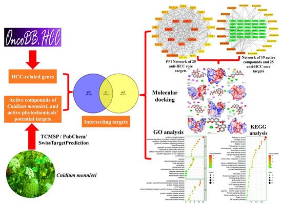 The VENNY 2.1 online tool (https://bioinfogp.cnb.csic.es/tools/venny/, accessed on 11 March 2022) was used to identify intersected targets between the potential protein targets of active phytochemicals in Cnidium monnieri and HCC-related genes [28].