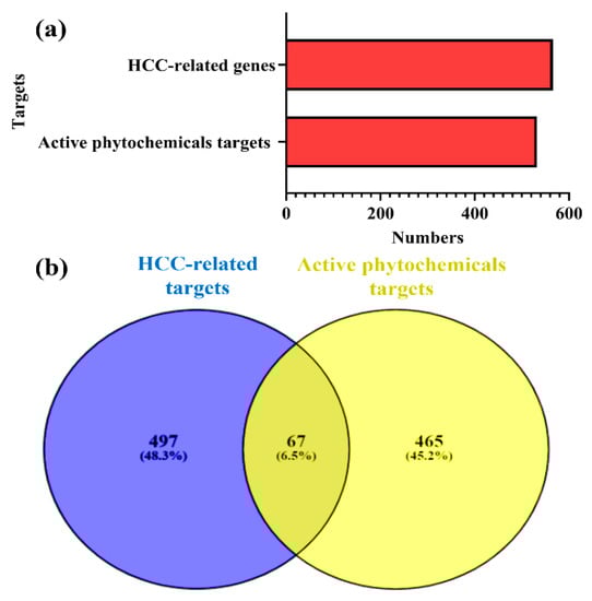 Intersecting targets were recognized between the HCC-related genes and potential protein targets of active phytochemicals using the VENNY 2.1.0. online system [28]. A total of 67 intersecting targets were identified between them, as presented in Figure 2b.
