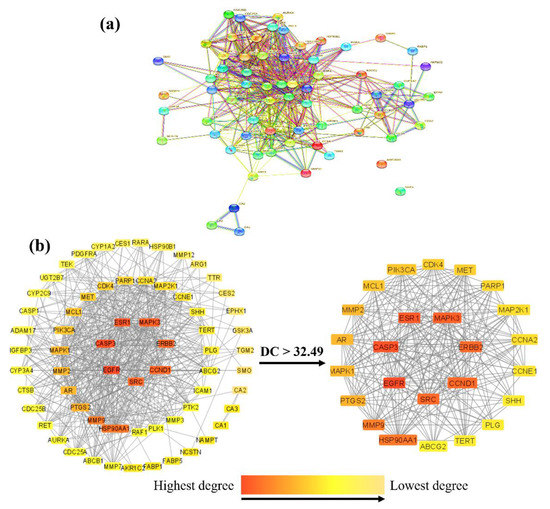 (a) PPI network of 67 intersecting targets constructed with STRING. (b) The PPI network of the 67 intersecting targets and the 25 potential anti-HCC core targets was constructed using Cytoscape software. Each node’s color denotes the degree, from red (highest) to yellow (lowest), as the node degree decreases.