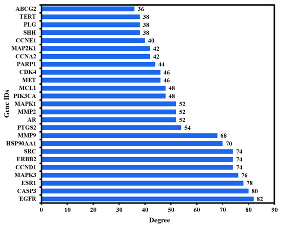 The 25 nodes that achieved the degree centrality (DC) criterion with an average value greater than 32.49 were further extracted and classified as potential anti-HCC core targets (Figure 3b). The 25 potential anti-HCC core targets, ranked according to DC, are depicted in Figure 4 as a bar graph. The top 6 potential anti-HCC core targets, i.e., EGFR, CASP3, ESR1, MAPK3, ERBB2, and CCND1, were chosen for molecular docking studies, with key active phytochemicals described in Section 2.6.
