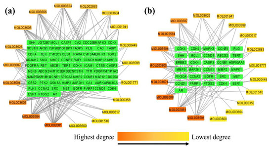 (a) Network between the 19 active phytochemicals and 67 intersecting targets. (b) Hub network between the 19 active phytochemicals and 25 potential anti-HCC core targets. Each node’s color denotes the degree, from red (highest) to yellow (lowest), as the node degree decreases.