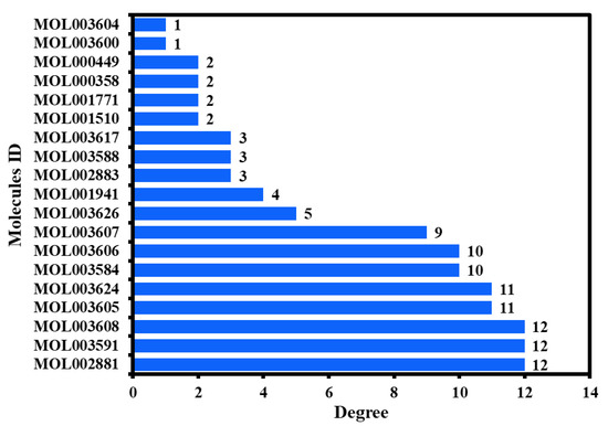 Furthermore, as seen in Figure 5b, a hub network was constructed between the 19 active phytochemicals and 25 potential anti-HCC core targets (Section 2.5). Each of the 19 active phytochemicals acted on the 25 potential anti-HCC core targets. The 19 active phytochemicals are shown in Figure 6 as a bar graph based on their degrees in the hub network.