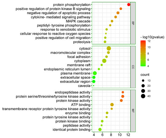 GO enrichment analysis was performed on 67 intersecting targets employing DAVID web-based tool (Version 6.8) [32]. The 239 BP, 42 CC, and 59 MF terms were found to meet the screening threshold of p ≤ 0.05. The top 10 enrichment terms of BP, CC, and MF are presented in a bubble diagram (Figure 7). The results of GO enrichment analysis indicated that the gene targets are implicated in multiple BPs, such as protein phosphorylation, positive regulation of protein kinase B signaling, negative regulation of the apoptotic process, cytokine-mediated signaling pathway, MAPK cascade, proteolysis, positive regulation of cell migration, etc. In the enriched CC category, gene targets are implicated in the cytosol, cytoplasm, plasma membrane, extracellular region, extracellular space, macromolecular complex, etc. GO enrichment analysis results showed that the enriched MF ontologies are dominated by ATP binding, identical protein binding, proteins kinase activity, protein serine/threonine kinase activity, enzyme binding, proteins kinase binding, etc.