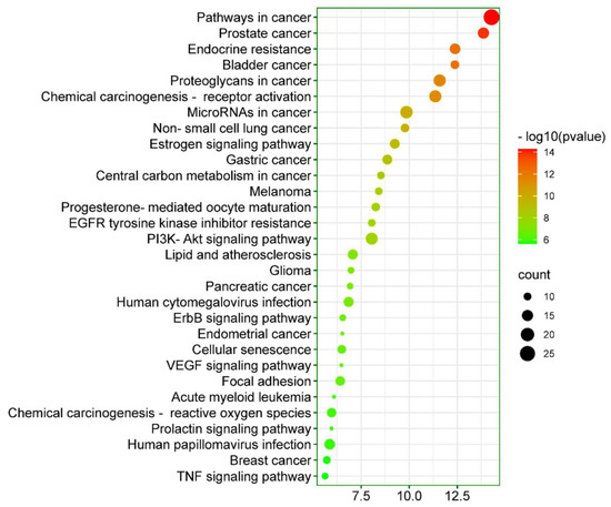 KEGG pathway analysis was performed on 67 intersecting targets to elucidate the molecular mechanism by which Cnidium monnieri treats HCC using the DAVID web-based tool (Version 6.8) [32]. A total of 117 enriched KEGG pathways were found to meet the screening threshold of p ≤ 0.05. The top 30 enriched KEGG pathways were further presented in bubble plot form, as displayed in Figure 8. The results of the KEGG pathway enrichment analysis showed that the molecular mechanisms by which Cnidium monnieri treats HCC may be implicated in pathways in cancer, proteoglycans in cancer, chemical carcinogenesis receptor activation, microRNAs in cancer, PI3K-AKT signaling pathway, estrogen signaling pathway, TNF signaling pathway, VEGF signaling pathway, ErbB signaling pathway, EGFR tyrosine kinase inhibitor resistance, etc. These signaling pathways could all function together in Cnidium monnieri’s anti-HCC therapeutic effects.