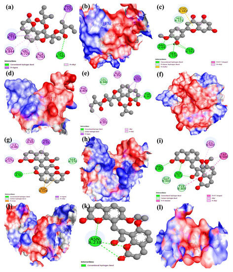 The molecular docking of eight key active phytochemicals of Cnidium monnieri (as determined in Section 2.6) with six anti-HCC core targets (as determined in Section 2.5) was performed. The findings are summarized in Table 2. The docked complexes that showed the best binding affinities are shown in Figure 9a–l. The lower the binding energy of the phytochemicals, the greater their affinity for the targets (proteins). The molecular docking results demonstrated that all key active phytochemicals of Cnidium monnieri could bind with EGFR, CASP3, ESR1, MAPK3, and CCND1 with strong binding affinity. However, they had a moderate binding affinity with ERBB2. Among eight active phytochemicals, Ar-curcumene, and (E)-2,3-bis(2-keto-7-methoxy-chromen-8-yl)acrolein presented excellent binding affinity with EGFR with the least energy score < −8.0. The phytochemicals Diosmetin, (E)-2,3-bis(2-keto-7-methoxy-chromen-8-yl)acrolein, and Ar-curcumene showed a greater affinity for CASP3 and exhibited the least energy score < −6.0 compared with others. Cniforin B and O-isovalerylcolum Bianetin demonstrated excellent binding affinity to ESR1 and had the lowest energy score, < −8.5, as compared with other phytochemicals. The phytochemical (E)-2,3-bis(2-keto-7-methoxy-chromen-8-yl)acrolein binds to MAPK3 and CCDN1 with higher affinity, with −8.1 and −8.2 energy binding scores, respectively. (E)-2,3-bis(2-keto-7-methoxy-chromen-8-yl)acrolein has a modest binding affinity for ERBB2 with an energy score of −4.3.