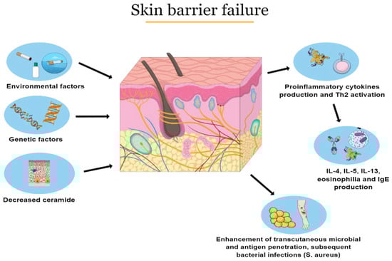 The pathogenesis of the disease is complex and multifactorial involving skin barrier failure, local and systemic immune dysregulation, gut, and skin dysbiosis and also genetic factors interacting with each other [,]. Skin barrier defects may be linked with mutations of filaggrin gene, a structural protein expressed in the stratum corneum of the skin []. In particular, homozygous mutations of filaggrin gene are related to an augmented risk of severe AD, earlier onset and longer persistence of the disease []. Moreover, other factors, such as a reduction in cutaneous ceramides, lead to trans-epidermal water loss and an enhanced penetration of irritants, allergens, and microbes into the skin []. Skin barrier disruption is responsible for chronic inflammation with epidermal hyperplasia and cellular infiltrates (dendritic cells, eosinophils, and T-cells) []. In particular, an over-expression of T cells leads to the release of chemokines and pro-inflammatory cytokines that promotes IgE production as well as local and systemic inflammation (Figure 1) [].