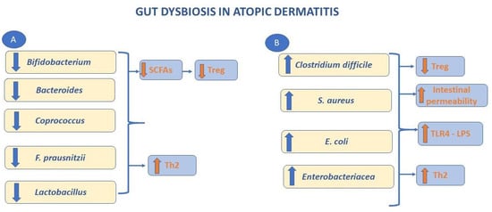 Lastly, microbiota abnormalities are present in patients with AD, showing a low degree of diversification in terms of bacterial colonization []. Furthermore, it has been demonstrated that there is an overgrowth of skin bacteria, such as Staphylococcus aureus [], which colonizes about 90% of these patients, and Corynebacterium species in conjunction with a reduction of Streptococcus, Propionibacterium, Acinetobacter, Corynebacterium, and Propionibacterium []. Moreover patients with AD have gut microbial alteration showing increased Escherichia coli, Clostridium difficile, and Staphylococcus aureus and a decrease of beneficial microbes, such as Lactobacillus and Bifidobacterium (Figure 2) [].