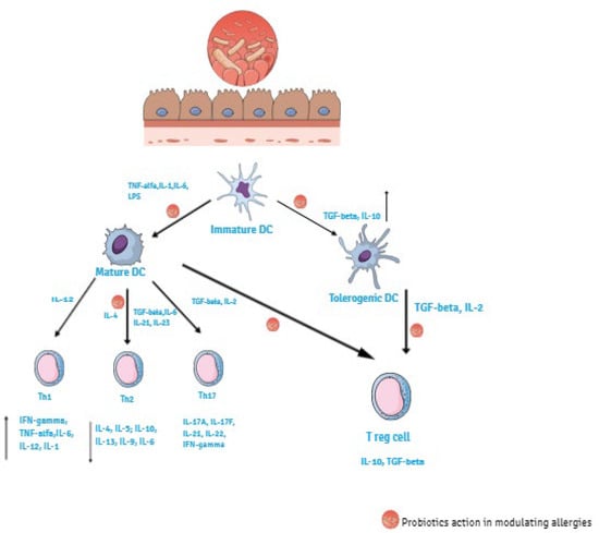 The immune system includes innate and adaptive immunity, which work together. The innate immune reacts immediately to infectious agents representing the first line of defense against pathogens. The protagonists in the innate immune response are surface barriers, specialized phagocytes (neutrophils, monocytes, and macrophages), soluble factors, DC, as well as natural killer (NK) cells that rapidly react to the presence of virus-infected cells by killing the infected target cell []. Pathogen-associated molecular patterns (PAMPs) are recognized by the cellular receptors on the surface of immune cells called pattern recognition receptors (PRRs). They include Toll-like receptors (TLRs) expressed mainly by macrophages and DCs, Nod-like receptors (NLRs), G protein-coupled receptors (GPGRs), and the aryl hydrocarbon receptor (AHR) []. The involvement of PRRs results in cellular activation. Activation of DC causes maturation and cytokines production that also influence the adaptive immune system, particularly the polarization of T-cell responses []. The adaptive immune system because of their ability to recognize and remember an impressive number of antigens, can provide a more effective protection against pathogens. Key players in adaptive immunity are lymphocytes B and T. B cells contribute to the immune response by secreting antibodies (humoral immunity), whereas T cells act in cell-mediated immunity. T cells include T helper cells (CD4+) and T cytotoxic cells (CD8+) []. Adaptive immune response is induced by the activation of antigen presenting cells (APC). DC are the major APC and they play a central role in regulating immune response. Differentiation of immature DC into mature or tolerogenic DC occur in presence of anti-inflammatory stimuli such as transforming growth factor (TGF)-β, retinoic acid and IL-10. Matured DC promote T cells differentiation towards Th1 or Th2 phenotypes with polarized cytokine secretion. Matured DC interact with naïve T cells (CD4+) and depending on the resulting cytokine produced by the CD4+ cells they differentiate to different Th subsets, promoting either an inflammatory response (Th1, Th2, Th17) or a regulatory one (Treg). Th1 differentiation occur in presence of IL-1, Il-6, IL-12, IFN-γ, and TNF-α. These cytokines activate macrophages, induce killed mechanisms, including cytotoxic cells, upregulate tumor immunity and intracellular pathogens, and are involved in autoimmunity. Th17 differentiation happens in the presence of IL-17A, Il-17F, IL-21, IL-22, and IFN-γ. Th2 differentiation occurs in the presence of IL-4, IL-5, IL-13, IL-9, and IL-6 and is involved in allergic reactions, allowing the production of allergen-specific IgE by B cells helping to induce eosinophil production [,]. As a result of IgE attachment to the Fc receptor on the surface of mast cells and basophil cells, the degranulation of the latter occurs, thereby contributing to the inflammation and the symptoms of allergies. Moreover, tolerogenic DC stimulate Treg cells in the presence of IL-2 and TGF-β. Treg cells represent a specialized T cell subpopulation determinant for immune homeostasis maintenance regulating Th1 and Th2 balance. They down-modulate IgE synthesis, reduce allergic reactions, and are responsible for the state of unresponsiveness of the immune system to self- peptides []. Treg cells include ‘natural’ Treg cells (nTreg) and, ‘inducible’ Treg cells (iTreg), which are subdivided into: induced Treg cells, type 1 regulatory T cells (Tr1), TGF-β expressing Th3, IL-17 producing FoxP3 Treg cells, CD8+Treg cells, double negative CD4 CD8 TCRαβ+Treg cells, and TCRγδ Treg cells []. A subset of DCs, expressing the integrin chain CD103+DCs, is the major population of DCs carrying antigen from the intestine to the mesenteric lymph nodes where they induce the differentiation of naïve T cells into Tregs. CD103+DCs are considered major drivers of tolerance in the intestine and are crucial for inducing Treg cells. They are particularly efficient to metabolize vitamin A to retinoic acid. Vitamin A conversion is essential for CD103+DCs to maintain their tolerance-inducing phenotype, including through the activation, expansion, and gut homing of Tregs []. An important inducer of allergen tolerance is forkhead box P3 (FOXP3), a transcription factor essential for Treg function. It is mainly expressed in a subset of CD4+ T-cells that play a suppressive role in the immune system. Many factors such as cytokines and non-cytokine factors regulate the generation of FOXP3+ T-cells. For example, retinoic acid, produced by the dendritic cells and epithelial cells in the intestine, works together with TGF-β1 and promotes the generation of small intestine-homing FOXP3+ T-cells by upregulating the expression of FOXP3 and gut homing receptors [], a transcription factor expressed by FOXP3+Treg cells together with CD25 as well as IL-10 and TGF-β production, which are cytokines that in general suppress immune responses []. The disruption of Th1/Th2 balance, which results in a prevalence of Th2 cell subset and their secretory cytokines, is the cause of the development of allergic disease []. Probiotic bacterial cells, as well as most antigens and commensal bacteria, reach the intestinal lumen by M cells and DC. Probiotics exert their immunomodulatory effects on allergic diseases, balancing the Th1/Th2 immune response, stimulating Th1 and decreasing Th2 response through different cytokines secretion []. They act by various pathways: (a) promoting the differentiation of immature DCs into mature or tolerogenic DCs in presence of anti-inflammatory cytokines, such as IL-10, TGF-β; (b) inducing the differentiation and proliferation of Tregs cells via the induction of CD4+ Foxp3+ cells and CD103+DCs in the presence of IL-2 and TGF-β (Figure 3) [].