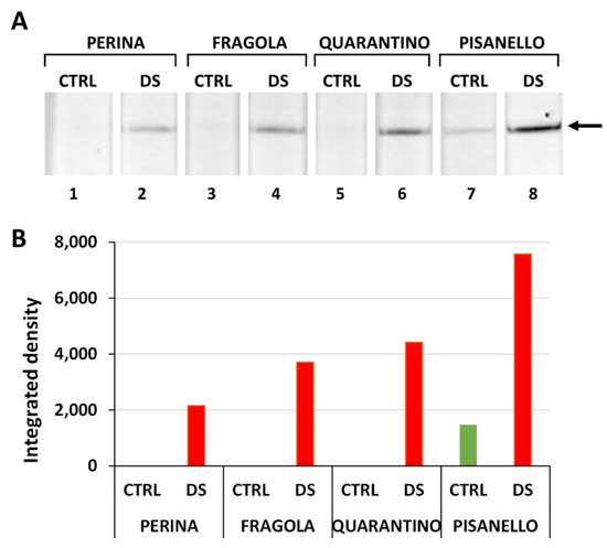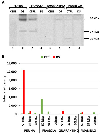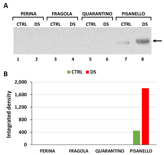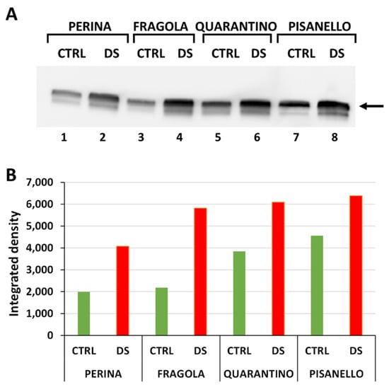 Aquaporins are proteins located in the plasma and intracellular membrane and are well known transporters of H2O and CO2, two important substrates for photosynthesis [34]. The blot in Figure 5A shows quite different protein content between cultivars. Three major immunoreactive bands were identified, at 50, 37, and 25 kDa. Bands were not present in all samples but showed an extremely specific distribution with respect to both individual cultivars and molecular weights. Densitometric analysis in Figure 5B shows a clear increase of the 50-kDa aquaporins in the Perina DS cultivar compared to its control. On the contrary, the cultivar Fragola is characterized by a decrease of both 50- and 37-kDa aquaporins in stressed samples. Finally, in Quarantino and Pisanello no relevant difference between the CTRL and DS samples is evident.