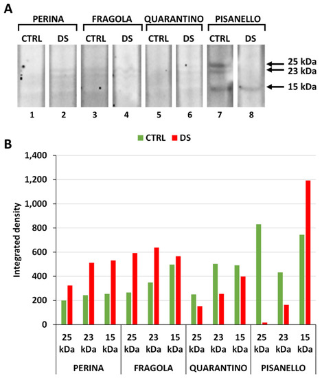 As a further general analysis of the stress response, we subsequently investigated cyclophylins (CYP). Figure 2A shows that the anti-cyclophilin antibody cross-reacts with at least three polypeptides (at 25, 23 and 15 kDa) in the stressed and control plant samples of each cultivar. Blottings were also subjected to densitometric analysis (Figure 2B) showing that cyclophilin levels increased in drought-stressed samples compared to controls. The levels of all three cyclophilin bands in the DS group of the cultivar Perina increased relative to CTRL. The same applies to the Fragola cultivar, although in a less pronounced way. In contrast, the intensity of bands in the DS sample of Quarantino cultivar decreases relative to CTRL. Finally, the cultivar Pisanello behaves in a peculiar way, by drastically decreasing the amount of the 25 kDa and 23 kDa bands but increasing the amount of the 15 kDa band.
