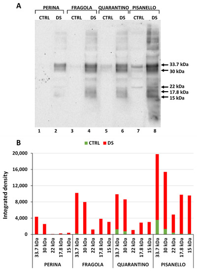 Electrophoresis was conducted on 10% bis-Tris SDS-PAGE [105] at pH 6.5–6.8. Volumes containing 30 μg of protein from the CTRL and DS samples of the four cultivars were loaded into each gel. Electrophoresis was carried out on a Criterion cell (Bio-Rad Laboratories, Segrate, Italy) equipped with a Power Pac BioRad 300 at 200 V for approximately 45 min. XT MOPS (Bio-Rad Laboratories, Hercules, CA, USA) was used as a running buffer. Transfer of proteins from gels to nitrocellulose or PVDF (for osmotin and dehydrins) membranes was performed using a Trans-Blot Turbo Transfer System (Bio-Rad Laboratories, Segrate, Italy) according to the manufacturer’s instructions (using the setting for low molecular weight proteins). After blotting, membranes were blocked overnight at 4 °C in 5% ECL Blocking Agent (GE HealthCare Dornstadt, Germany) with 0.1% Tween-20 in TBS (20 mM Tris pH 7.5, 150 mM NaCl). After washing with 1X TBS, membranes were incubated with the primary antibody for 1 h. Below is a list of the antibody used: