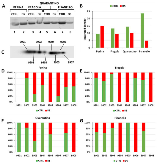 The 8 spots identified are more or less present in each case analyzed, at the level of cultivars as well as in the comparison between control and stressed samples. However, some substantial differences emerge. From a qualitative point of view, the differences between cultivars are minimal. Some cultivars are characterized by spots present only in stressed samples. For example, the cultivar Perina expresses the isoform 9905 only in the stressed sample. Even the cultivar Fragola shows a typical expression with the isoforms 9904 and 9905 being present only in the stressed samples. Others, such as the cultivar Quarantino, lack a specific spot, in this case 9906. Pisanello differs because some spots, such as 9904, are present only in the stressed sample, while 9905 is detected only in the control sample. Apart from the qualitative aspect, it is also noteworthy that the four cultivars differ in terms of the quality (usage) of individual spots. In the cultivar Perina, some isoforms are present correspondingly between control and stressed samples while others are typical of control samples (such as spot 9902) while 9905 is typical of stressed samples. The cultivar Fragola differs substantially from Perina because spots can be classified as almost exclusive to the control sample (spot 9901, 9902, 9906, 9907) and as exclusive to the stressed sample (spot 9904, 9905 and 9908). The cultivar Quarantino has a similar behavior to the Perina cultivar; the Pisanello cultivar is similar to the case of the Fragola cultivar with spots almost exclusive to the control sample and two spots (9904 and 9906) exclusive to the stressed sample. In the case of Pisanello, it is worth noting the absence of spot 9908.