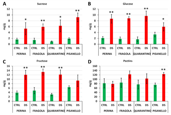 Sucrose is the main product of reactions involving 3-carbon sugars generated by photosynthesis and represents a form of energy storage and transport [47]. Figure 8A shows the increase in sucrose in DS cultivars as well as the higher amount of sucrose in the Pisanello cultivar than in Perina or Fragola. In contrast, dissimilar data were obtained for glucose (Figure 8B) and fructose (Figure 8C), respectively. Again, we observed an increase in these two carbohydrates in drought-stressed plants but, unlike sucrose, Pisanello was the cultivar with the lowest amount of glucose and fructose. In contrast, the cultivars Perina, Fragola, and Quarantino showed a significant increase in both sugars.