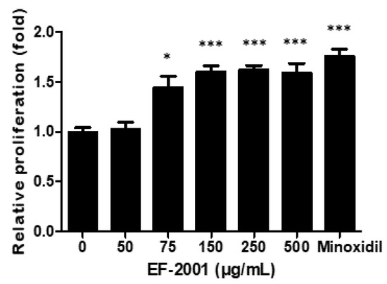 HDPCs play an important role in regulating hair growth. Therefore, we examined the effects of EF-2001 on HDPC proliferation using the MTT assay. The proliferation rate of HDPCs increased significantly after treatment with EF-2001 at 50, 75, 150, and 250 µg/mL for 48 h. At 150–500 μg/mL EF-2001, HDPC proliferation increased 1.5-fold (Figure 1).