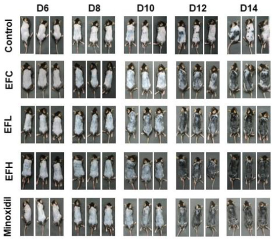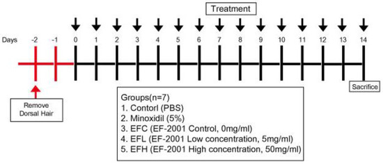 Male C57BL/6 mice (6-week-old) were purchased from Central Lab. Animal, Inc. (Seoul, Korea). The mice underwent a 14 d acclimation period for maintenance at 20–22 °C and 40–50% relative humidity with a controlled light–dark cycle. Food and water were provided ad libitum. The Institutional Animal Care and Use Committee (IACUC, YWCI-202003-005-01) of Yonsei University (Wonju, Korea) approved the protocol for this study. All steps to minimize pain in the animals were taken. The animals were divided into five randomized groups (n = 7) to study hair-growth-promoting activity. After acclimation, the dorsal hair of the mice was shaved using an electric shaver under isoflurane (Hana Pharm Co., Hwaseong, Korea) anesthesia. Next, the depilatory Niclean (Ildong Pharmaceutical Co., Ltd., Seoul, Korea) was applied to the backs of mice. After 48 h, hair was shaved, and the depilated area was treated with 200 µL each of the following: control: PBS, minoxidil: 5% minoxidil solution, EFC: 0 mg/mL EF-2001 in 3:1 mixture of acetone and olive oil, EFL: 5 mg/mL EF-2001 in 3:1 mixture of acetone and olive oil, and EFH: 50 mg/mL in 3:1 mixture of acetone and olive oil) once a day for 14 d (Figure 9).