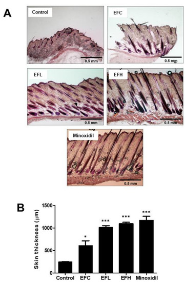 To confirm the effect of EF-2001 on hair follicles, skin tissues were stained using H&E, and hair-follicle depth and dermis thickness were observed (Figure 3). During the anagen phase, melanin synthesis begins, thickening the dermis layer, increasing the size of hair follicles, and making the dermis and subcutaneous fat deeply characterized. In anagen stage II, the hair follicles are located only in the dermal layer and do not reach the subcutaneous fat layer, but in anagen stage III, the hair follicles reach the subcutaneous fat layer [37]; the increased hair-follicle length decreases again during the catagen stage. Therefore, measuring changes in the length and thickness of the dermis and subcutaneous tissue due to the continuous growth of anagen hair follicles and degeneration of catagen hair follicles is of great significance in determining the hair cycle. Minoxidil treatment led to a significant increase in the thickness of the skin compared with the control treatment, and thickness also increased remarkably after EFL (5 mg/mL) and EFH (50 mg/mL) treatment. Therefore, EF-2001 improves hair growth by extending the anagen phase in the hair cycle.