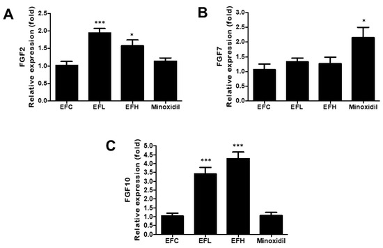 As shown in Figure 4, the expression of FGF7 in the minoxidil-treated group was twice of that in the EFC-treated group. However, FGF2 and FGF10 expression in the minoxidil-treated group did not differ from that in the EFC-treated group. The expression of FGF2 and FGF10 in the EFL- and EFH-treated groups was higher than that in the EFC-treated group, while FGF7 expression was similar in the EFL-, EFH-, and EFC-treated groups. The mRNA expression of FGF2 was 1.02 ± 0.24, 1.95 ± 0.25, 1.57 ± 0.37, and 1.13 ± 0.20 for FGF2, 1.07 ± 0.41, 1.34 ± 0.23, 1.26 ± 0.49, and 2.14 ± 0.78 for FGF7, and 1.04 ± 0.35, 3.43 ± 0.76, 4.27 ± 0.83, and 1.06 ± 0.42 for FGF10 in the EFC-, EFL-, EFH-, and minoxidil-treated groups, respectively.