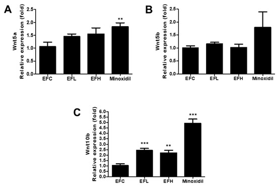 The effect of EF-2001 on the mRNA expression of hair-growth-related genes, including (A) Wnt5a, (B) Wnt5b, and (C) Wnt10b, in C57BL/6 male mice. Quantitative PCR analysis of the mRNA expression of Wnt5a, Wnt5b, and Wnt10b in the EFC-, EFL-, EFH-, and minoxidil-treated groups. ** p < 0.01, *** p < 0.001 versus EFC. Data are expressed as mean ± SD (n = 5).
