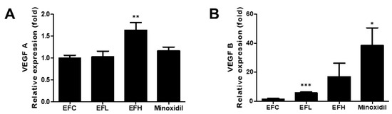 The effect of EF-2001 on the mRNA expression of hair-growth-related genes (A) VEGF-A and (B) VEGF-B in C57BL/6 male mice. Quantitative PCR analysis of the mRNA expression of VEGF-A and VEGF-B in the EFC-, EFL-, EFH-, and minoxidil-treated groups. * p < 0.05, ** p < 0.01, *** p < 0.001 versus EFC. Data are expressed as mean ± SD (n = 5).