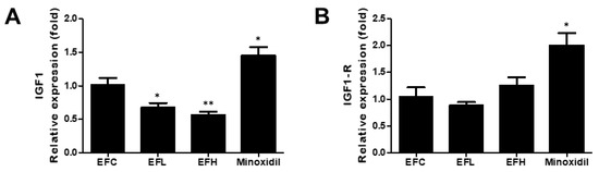 The effect of EF-2001 on the mRNA expression of hair-growth-related genes (A) IGF1 and (B) IGF1-R in C57BL/6 male mice. Quantitative PCR analysis of the mRNA expression of IGF1 and IGF1-R in the EFC-, EFL-, EFH-, and minoxidil-treated groups. * p < 0.05, ** p < 0.01 versus EFC. Data are expressed as mean ± SD (n = 5).